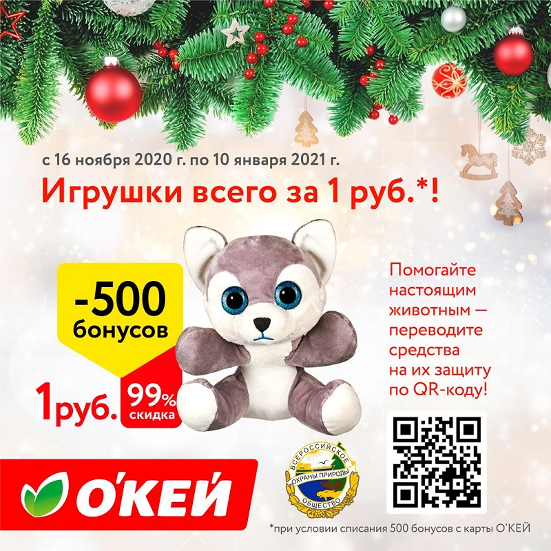 В рамках акции на прилавках сети гипермаркетов «О’ КЕЙ» будут представлены мягкие игрушки в виде этих животных. Часть средств от реализации этих товаров «О’ КЕЙ» также направит во Всероссийское общество охраны природы. За покупку на сумму более 1 200 рублей покупатели смогут получить экоукрашение к Новому году, которым можно украсить елку. Как сам декор, так и упаковка изготовлены из сертифицированных FSC материалов, подтверждающих что продукция произведена из переработанного сырья, а значит внесен вклад в сохранение лесов и окружающей среды. FSC (Forest Stewardship Council) — это единственная система лесной сертификации, которая поддерживается крупнейшими национальными и международными, экологическими и социальными организациями, такими как Всемирный фонд дикой природы (WWF).