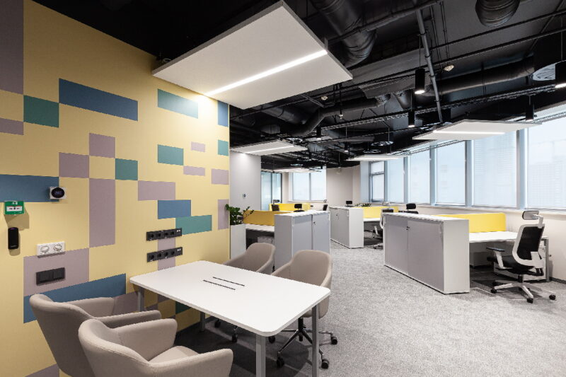 Акустические панели и потолки появились в зонах для сотрудников, а акустические экраны между рабочими местами сохраняют личные границы коллег. Яркие цвета – сиреневый, желтый и зеленый, объединяются нейтральным серым фоном, сохраняющим рабочую атмосферу концентрации. В общественных пространствах создана неформальная обстановка для нетворкинга. Дополнением фуршетных столов в кофе-пойнте стали кресла с необычными спинками и диван, изготовленный по индивидуальном проекту в форме лемнискаты – символа бесконечности. В зонах отдыха для обслуживающего персонала, клинеров и водителей, создали уютные блоки с мини-кухнями, чтобы сотрудники могли комфортно отдыхать в перерывах.
