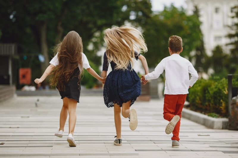 Children in a summer city. Kids runing together.